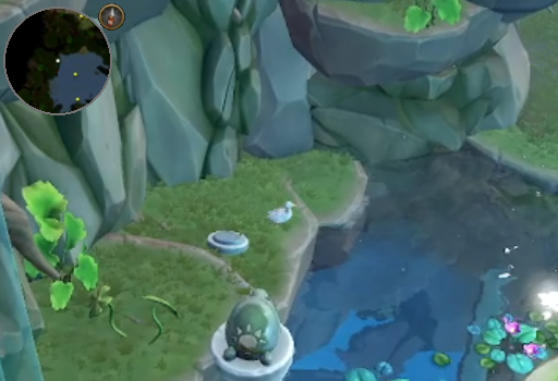 Interact with the tree bud next to the turtle sculpture and you will now have a mouth full of sticky tree sap. Make your way to the toad statue to the North and interact with it. This will cause the statue to start blowing bubbles.